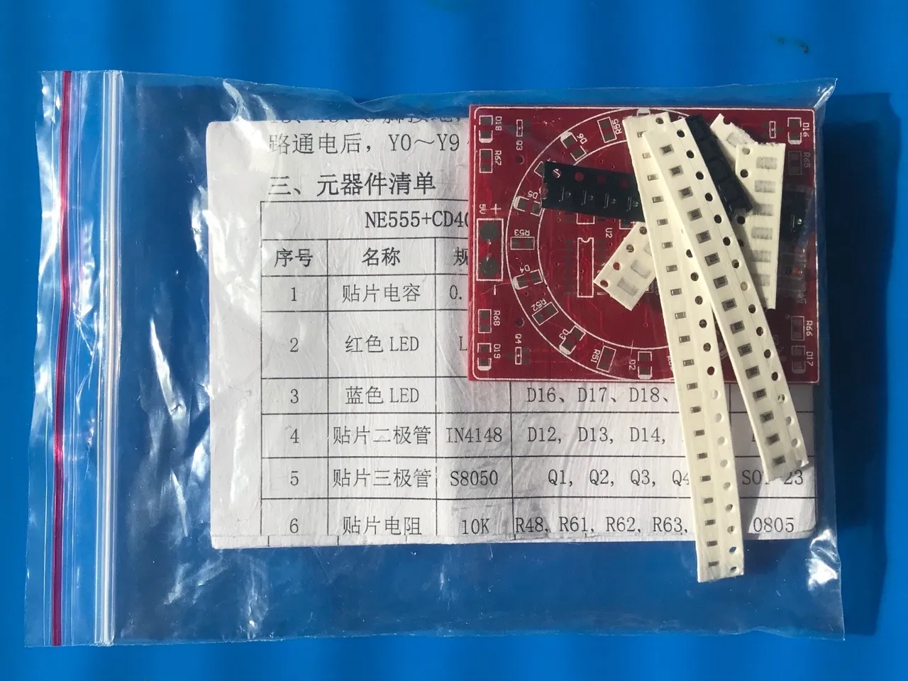 Tāpēc no AliExpress pa 79 centiem pasūtīju lodēšanas mācīšanās komplektu. Nosaukums “2016 New Both Sides SMT SMD Electronic Component Welding Practice Board PCB Soldering DIY Kit Skill Training Mini Version”