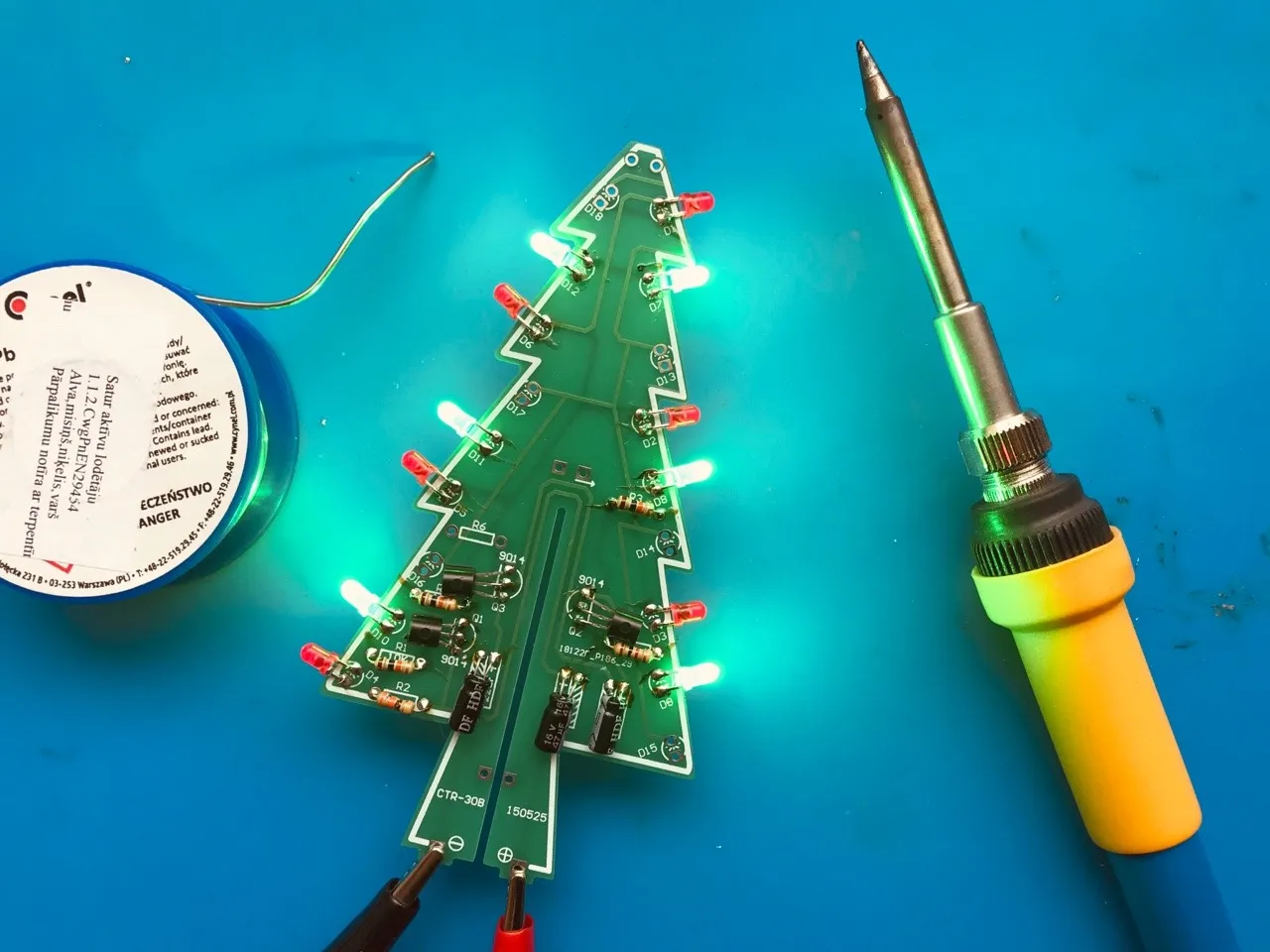 Kad nedaudz komponentes palodētas, jāpārbauda. Ar rezistoru vērtībām bija puzlis. Uz katrām sešām vienas krāsas gaismas diodēm, ir viens strāvu ierobežojošs rezistors. Un tā kā dažādu krāsu diodēm ir dažādi spriegumi, tad tie jāpiemeklē tā, lai visas trīs krāsas spīdētu apmēram vienādi. Pavisam vienādi nesanāca. Domāju ka vērības vajadzētu vispār savādākas nekā komplektā.