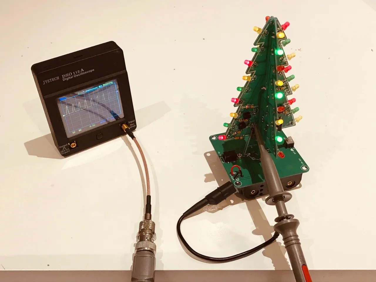 Šis nu ir īstais brīdis foto palielīties ar manu kabatas osciloskopu ar touch screen un iebūvētu batereju DSO112A! Brīnišķīgs aparātiņš pa 36.88€ no Aliexpress. Specifikācija līdz 2MHz, 2mV līdz 20V izšķirtspēja spriegumā un 1us līdz 50s laikā. Zem 5us triggers nav pieejams, praktiski gan vēl tā nav bijusi problēma. Savādāk uzvedas kā normāls mazs oscils ar AC/DC “coupling”, “raising” vai “falling” trigeru izvēli, “single shot” vai auto, u.t.t.