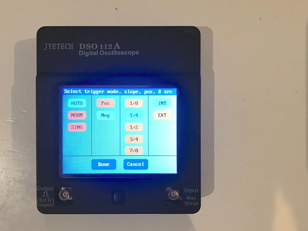 Ir arī pieslēgvieta ārējiem trigeriem un iebūvēts signāla ģenerators (1Hz, 10Hz, 100Hz, 1KHz, 10KHz, 100KHz, 1MHz un 440Hz). 440Hz laikam būs klavieru skaņošanai…