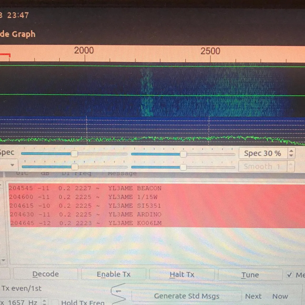 Arduino FT8 bāka. Sūta iepriekš ieprogrammētu FT8 signālu ar signāla ģeneratoru (bez WSJT-X, bez datora). Testam iedarbināju pa tiešo no Si5351 signāla ģeneratora (0.06W)